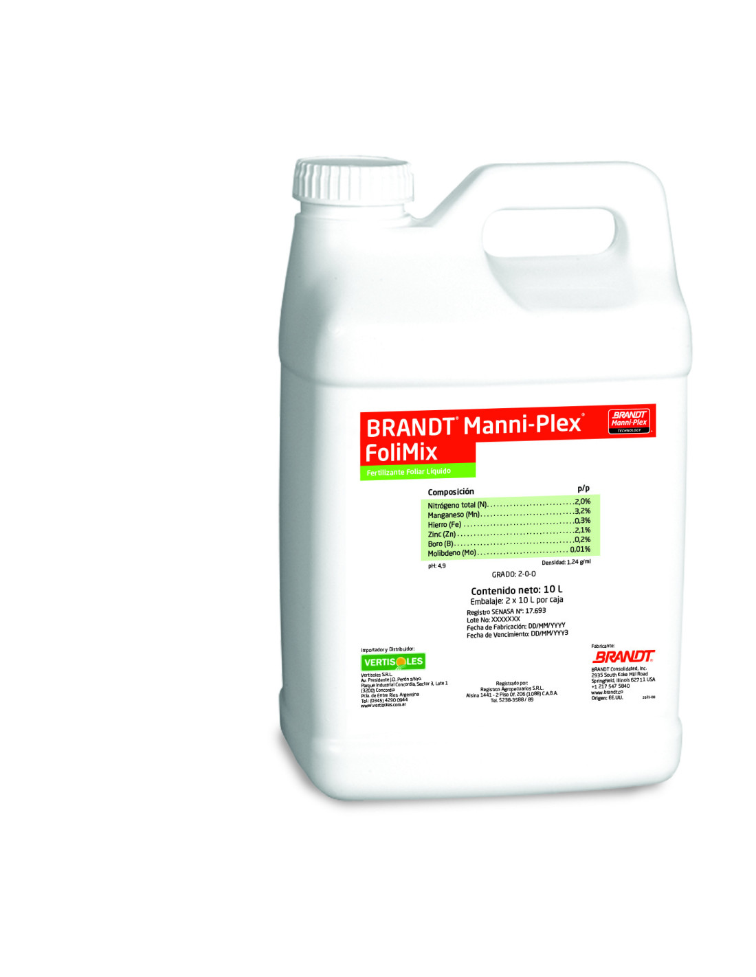 BRANDT MANNI-PLEX FOLIMIX es un fertilizante foliar ideado para su aplicación sobre cualquier tipo de cultivo para la prevención y corrección de deficiencias de micronutrientes, a utilizarse dentro de un programa de nutrición balanceado. Su tecnología le confiere una alta eficiencia de entrega y aprovechamiento por las plantas.
